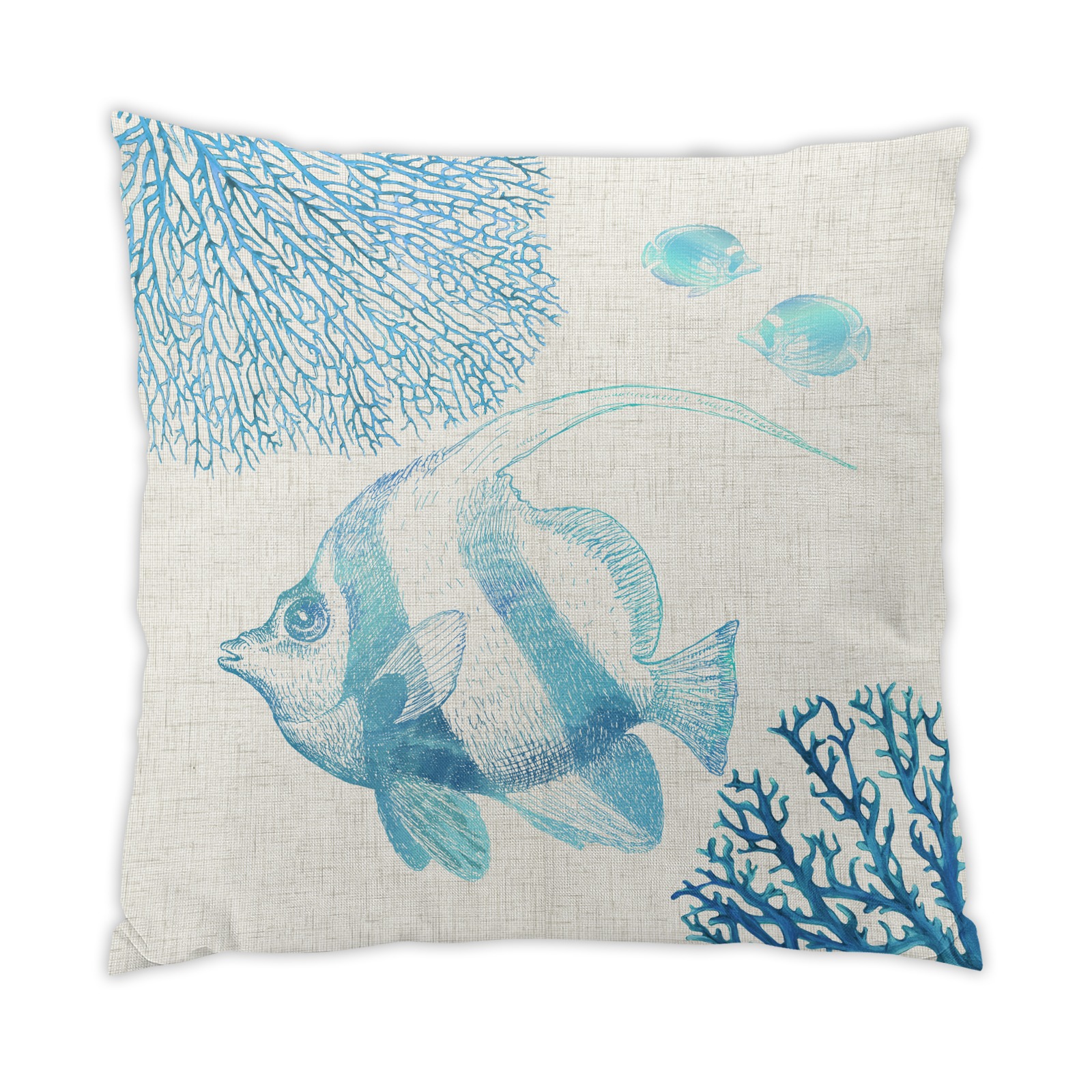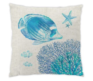 Housse de coussin de style marin, inspirée du monde de la mer, de la plage, des océans, des ports de plaisance. Motif de poisson tropical et corail en aquarelle. L’effet lin, usé et vintage en fait un objet de déco incroyable.