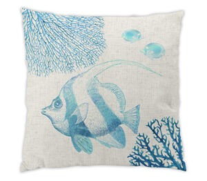 Housse de coussin de style marin, inspirée du monde de la mer, de la plage, des océans, des ports de plaisance. Motif de poisson tropical et corail en aquarelle. L’effet lin, usé et vintage en fait un objet de déco incroyable.