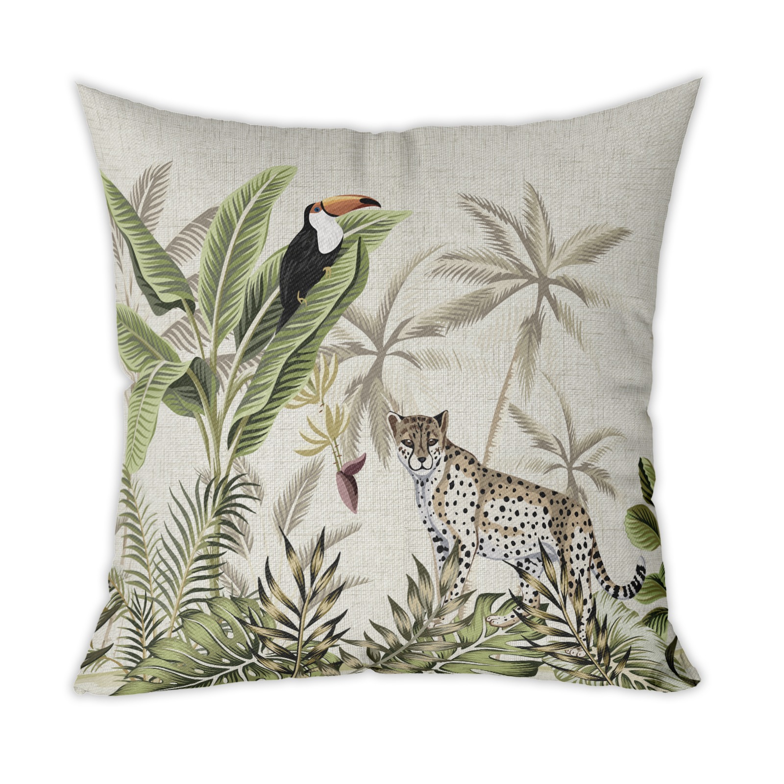 Housse de coussin de style tropical, une invitation au voyage au cœur de la jungle entre panthère et toucan. Plus qu’un coussin un véritable objet de déco exotique et sauvage !