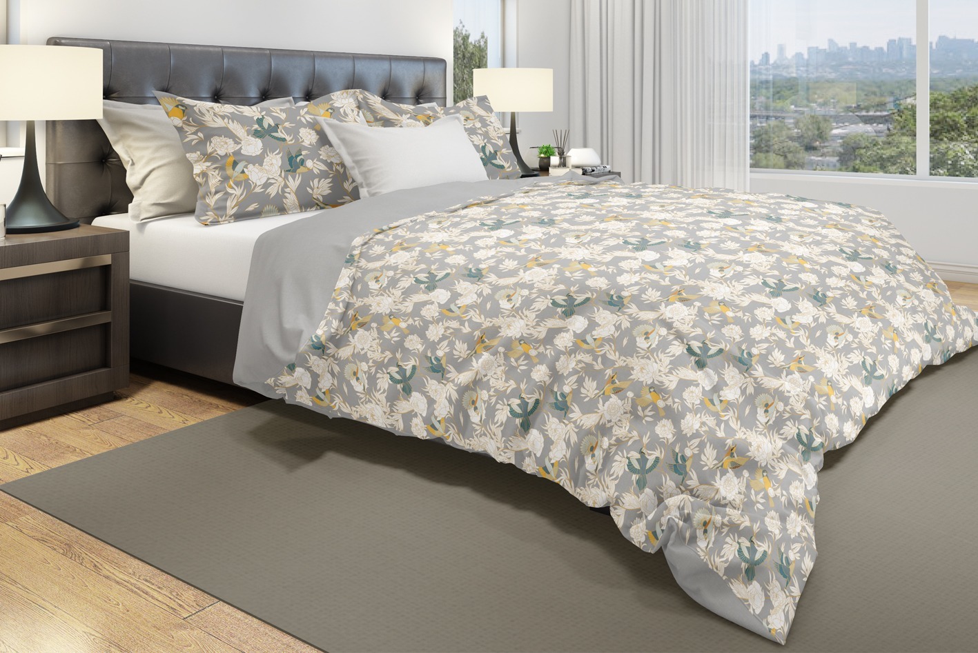 Housse de couette Paradis. Une parure de lit de style exotique, invitant au rêve parmi les oiseaux et au milieu des fleurs des iles. Sur fond gris, les motifs mélanges des couleurs actuelles jaune et bleu pour une décoration élégante et exotique.
